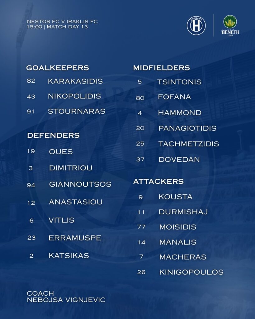 Παρακάτω μπορείτε να δείτε ολόκληρη την αποστολή για το ματς του Ηρακλή με τον Νέστο Χρυσούπολης σήμερα στις 15:00: