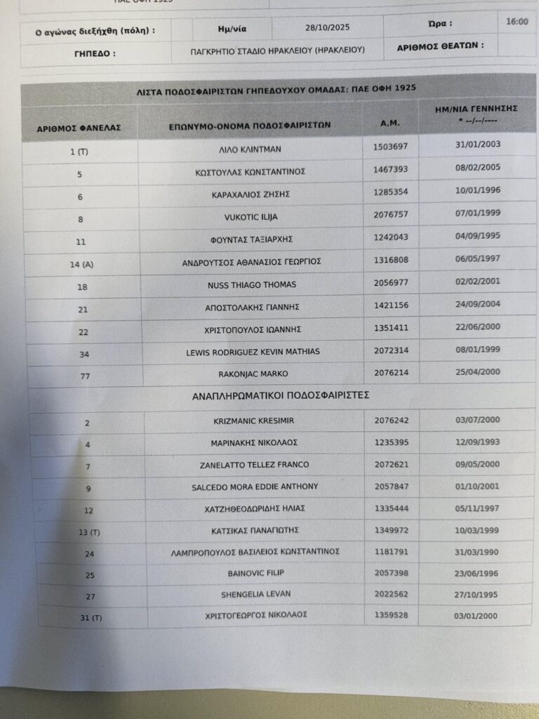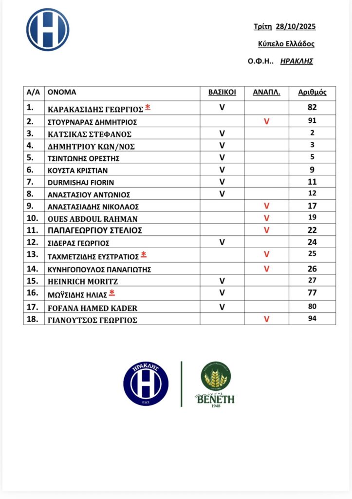 ΟΦΗ – ΗΡΑΚΛΗΣ: Οι αρχικές 11αδες
