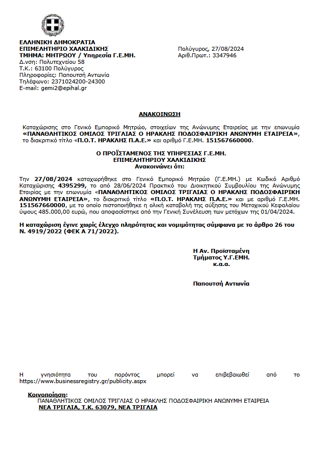 Ας δούμε λίγο το πώς κατάφερε να εξασφαλίσει την πλειοψηφία των μετοχών. Πέρυσι τον Ιούλιο είχε συμφωνήσει αρχικά με τον Στράτο Ευγενίου για την αλλαγή σελίδας στην ΠΑΕ. Λίγες βδομάδες αργότερα μπήκαν οι άνθρωποι του Μονεμβασιώτη στην ΠΑΕ και στο ΔΣ. Παράλληλα με την αλλαγή του ΔΣ έγιναν και δυο απανωτές αυξήσεις μετοχικού κεφαλαίου (στις 8/8 και στις 27/8). Συγκεκριμένα εντός του Αυγούστου του 2024 το μετοχικό κεφάλαιο της ΠΑΕ Ηρακλής αυξήθηκε από τα 350.000€ στα 1.371.700€, δηλαδή 390% αύξηση του μετοχικού κεφαλαίου. Αυτή η αύξηση έγινε από τον Παναγιώτη Μονεμβασιώτη και τους ανθρώπους του, και με ένα ποσό που ο Στράτος Ευγενίου δεν μπορούσε να καλύψει.