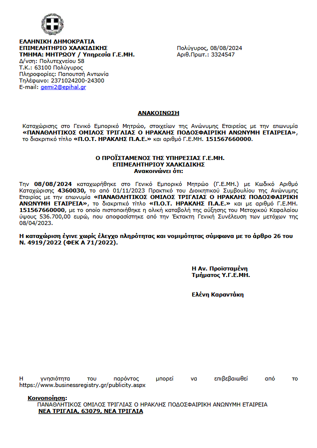 Παραθέτουμε παρακάτω τις αυξήσεις του μετοχικού κεφαλαίου της ΠΑΕ όπως φαίνονται στο ΓΕΜΗ: