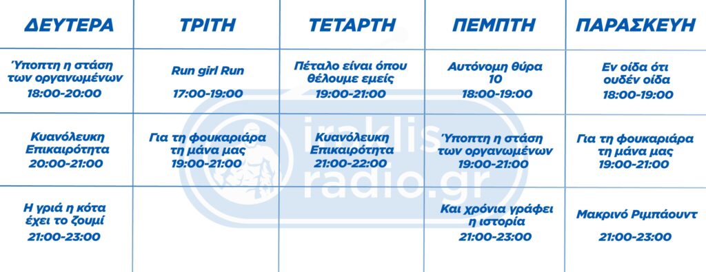 Το Iraklis Radio έχει επιστρέψει για τα καλά και πλέον είναι σε θέση να ανακοινώσει το νέο του πλήρες πρόγραμμα για την φετινή σεζόν. Οι περισσότερες εκπομπές έχουν αρχίσει και κάποιες αναμένεται να αρχίσουν μέσα στην εβδομάδα ή το προσεχές διάστημα. Συγκεκριμένα σήμερα ξεκίνησε η εκπομπή «Πέταλο είναι όπου θέλουμε εμείς» και την Παρασκευή ξεκινάει η εκπομπή «Εν οίδα ότι ουδέν οίδα». Επίσης από βδομάδα ξεκινάει και η νέα εκπομπή «Run Girl Run». Πάμε όμως να δούμε αναλυτικά το πρόγραμμα κάθε ημέρας.