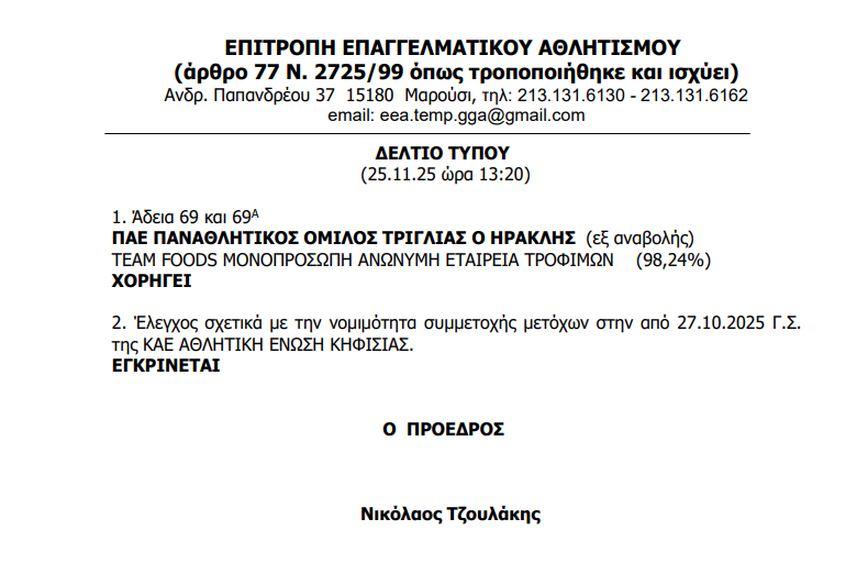 Όπως γράψαμε πριν λίγο, η ΕΕΑ χορήγησε τις άδειες 69 και 69Α στον Π. Μονεμβασιώτη ώστε να μπορέσει αυτός να αποκτήσει τις μετοχές της ΠΑΕ Ηρακλής. Σας παραθέτουμε και το επίσημο Δελτίο Τύπου από την επιτροπή, που ανακοινώνεται αυτό το γεγονός.