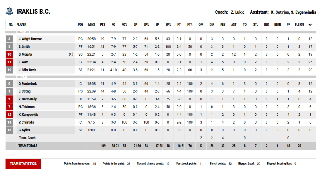 Πολύ θετικό ότι όλοι όσοι αγωνίστηκαν βρήκαν σκορ. Ο Ηρακλής είχε 5 παίχτες με πάνω από 10 πόντους, τους Φόρμαν (19π, 3ρ), Σμιθ (18π, 3ρ, 1ασ, 2 τάπες), Έντλερ-Ντέιβις (11π, 5ρ, 1ασ), Φάντερμπερκ (11π, 6ρ, 1ασ) και Στρονγκ (14π, 3ρ, 7ασ). Επίσης ξεχώρισε σαν στατιστικό οι 12 ασίστ του Μωραΐτη. Θετική η παρουσία του Χρηστίδη που μετά από καιρό αρχίζει να παίρνει χρόνο συμμετοχής, ενώ και η παρουσία του Ντάρκο-Κέλι έδειξε πόσο είχε λείψει το σουτ του και η εμπειρία του από την ομάδα.