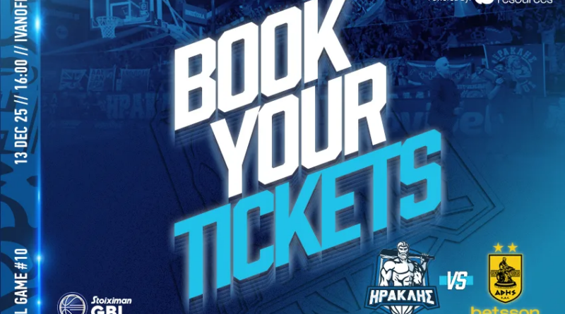 Η ΚΑΕ Ηρακλής ανακοινώνει ότι από σήμερα (08/12) τίθενται σε κυκλοφορία τα εισιτήρια για το παιχνίδι με τον Άρη Betsson, που θα γίνει το Σάββατο 13 Δεκεμβρίου στις 16:00, στο Ιβανώφειο, στο πλαίσιο της 10ης αγωνιστικής της Stoiximan Greek Basketball League.